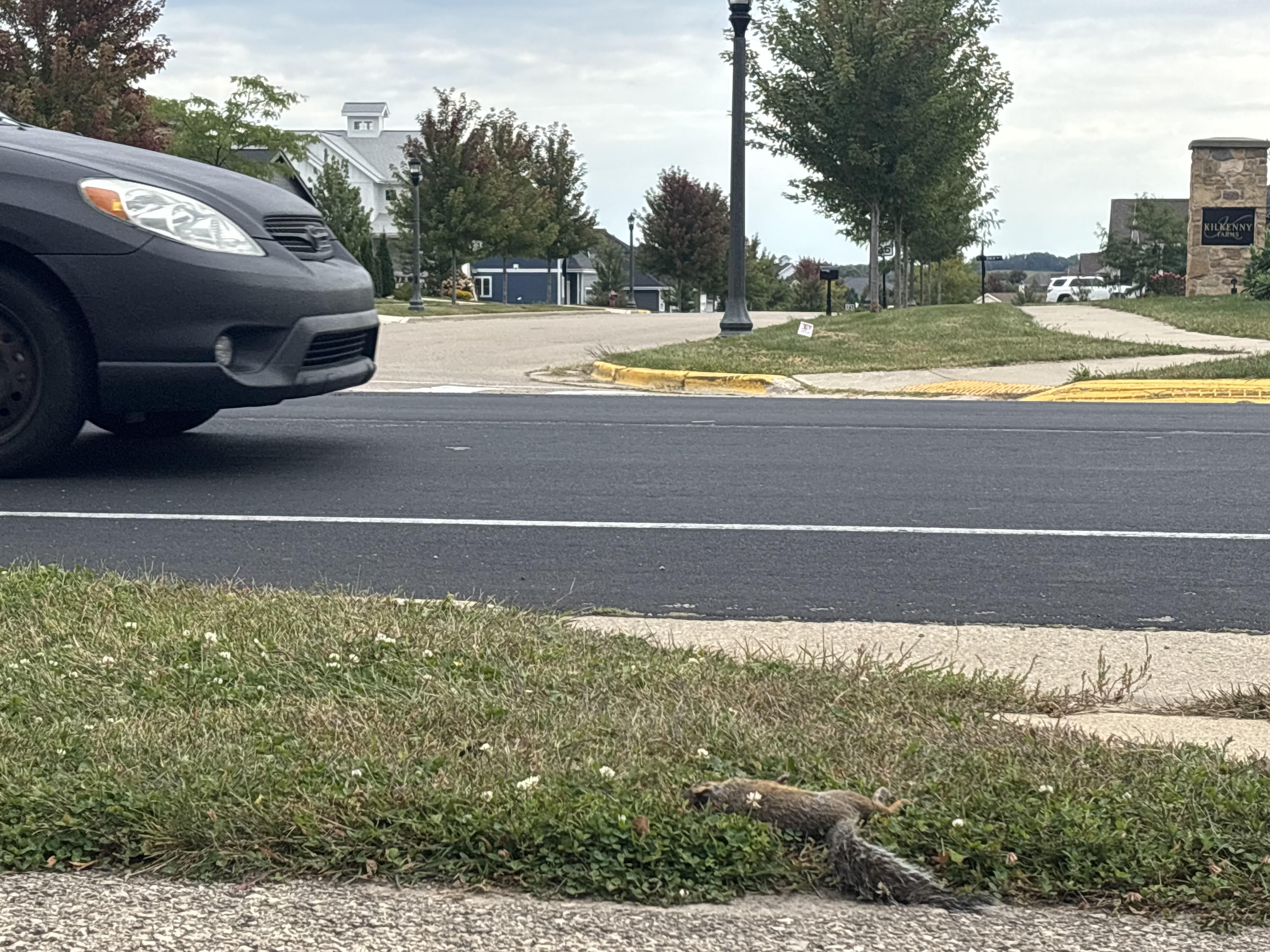 While it is unlikely that this squirrel was killed by a car, corpses in or along the roads are extremely common.