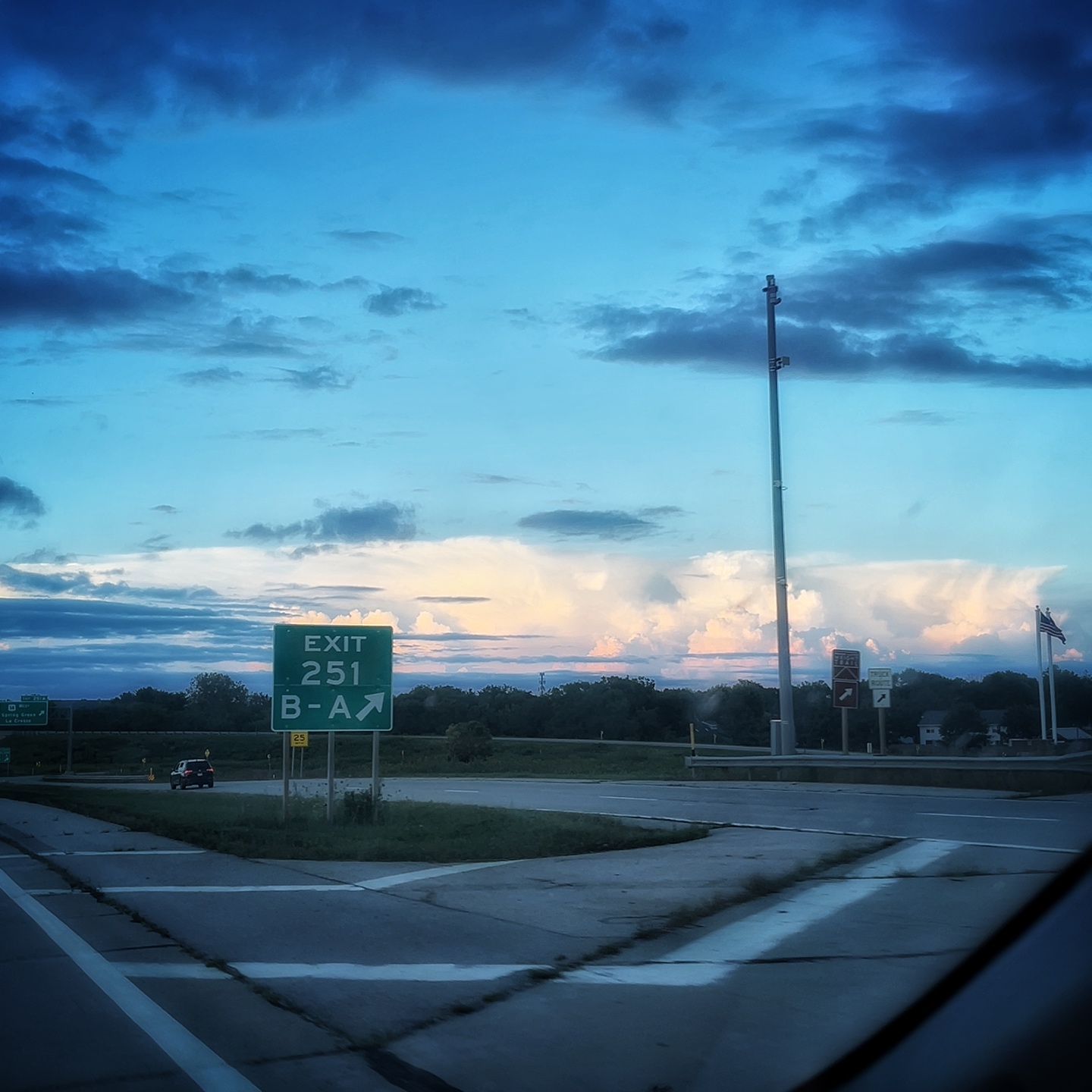 This is a picture I took driving home from a busy weekend in Minnesota. We had to leave at dawn because I had to be back for a dance dress rehearsal at noon. This is the sky at sunrise as we were driving home.
