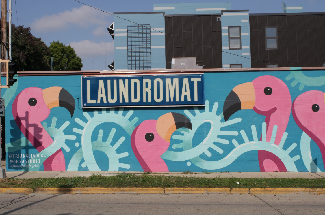 At 701 East Johnson Street is the iconic Flamingo laundromat mural. Created by Emiley Balsley, Ray Mawst, Brian Kehoe, and Triangulador, this art combines contrasting vibrant pinks and blues and is a favorite of Madison residents.
