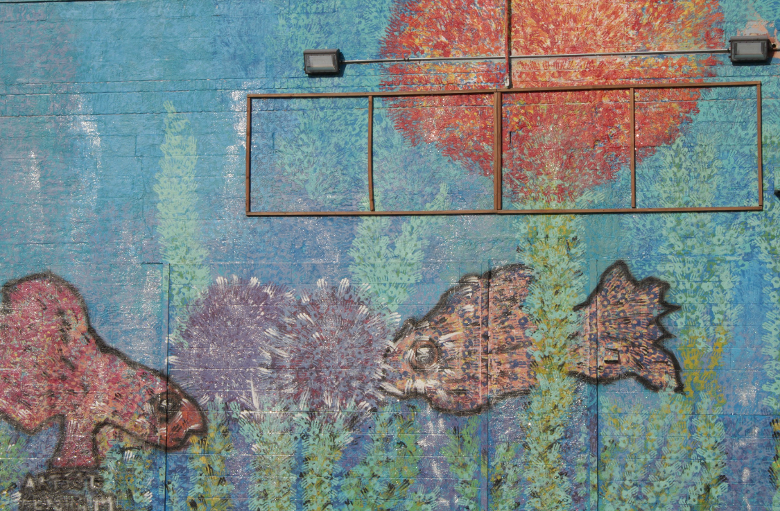 On the opposite side of the building to the “You are Beautiful” mural, there is the ocean mural. This piece is made up of hundreds, if not thousands, of handprints all combined together to make an underwater scene. Near the building is the Yahara river, which is a popular fishing spot near campus. *