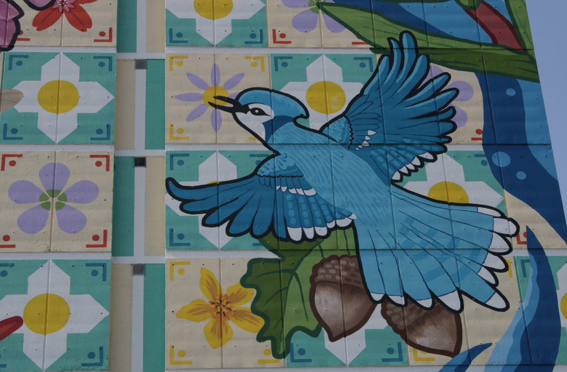 This mural was made by people at the Wil-Mar community center in Madison. The mural features many native plants and wildlife, such as the coneflower and monarch butterfly. The mural is near the community gardens and shows the community's connection to nature.